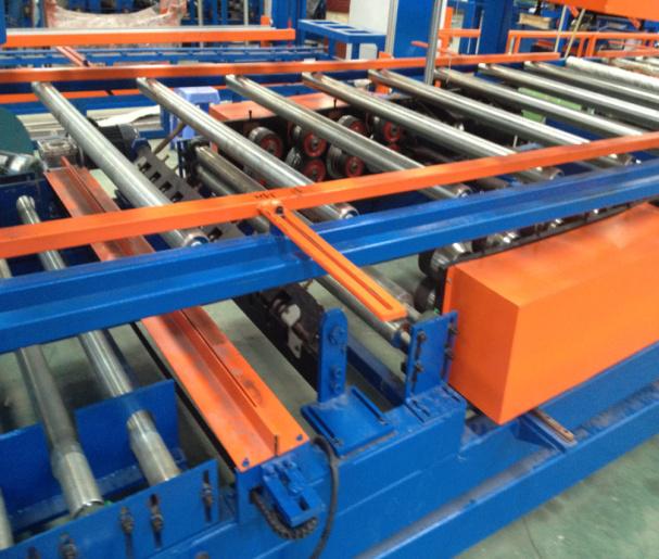 主要由瓦楞板壓型機和彩鋼復合機組成,可以一次性制做墻面彩鋼夾芯板或屋面彩鋼夾芯板,并且瓦楞板壓型機和復合機可以獨立生產(chǎn)。整條流水線壓型部分由彩鋼板開卷機、冷彎成型主機、切斷裝置組成,復合機部分由彩鋼板開卷,EPS板或巖棉板輸送,墻面淺波峰壓制,混合涂膠、加溫加壓、復合、平板卷邊、企口板翻邊、開槽、整邊、氣動夾緊、自動覆膜、自動切割、成品拖架組成;